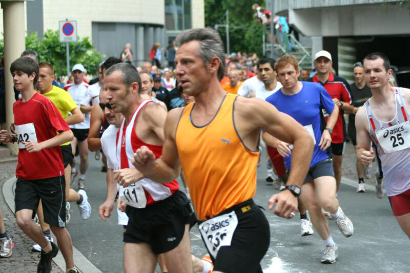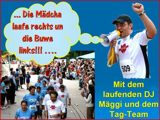 Um 18.00 Uhr erfolgte dann der Start des 10 km Hauptlaufs und des 5 km Jedermannlaufs. Die Strecke von 2,5 km führte durch die City von Illingen bis zum Kreisel Rosental, dann an der Rehaklinik vorbei und durch den Burgpark bis zur Illipse. Das waren beim Hauptlauf vier Runden und beim Jedermannslauf 2 Runden. Auch hier standen ungewöhnlich viele Zuschauer und feuerten die Läufer an. Das Läuferfeld war nicht so sehr von Topläufern geprägt als vielmehr von Hobbyläufern und Gruppierungen, bei denen der Spaß am Lauf im Vordergrund stand. Besonders auf sich aufmerksam machten das TAG-Team und das Familienberatungszentrum Illingen. DJ Mäggi vom TAG-Team lief mit einem Megaphon und heizte mit seinen Kommentaren die Stimmung zusätzlich auf. Im Zielbereich stand Bürgermeister König und winkte die Läufer mit der Deutschlandfahne ab.
