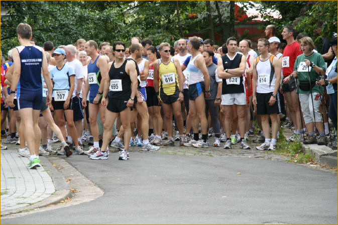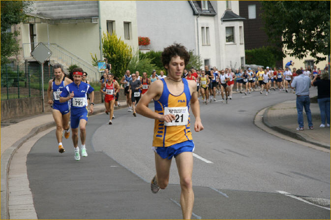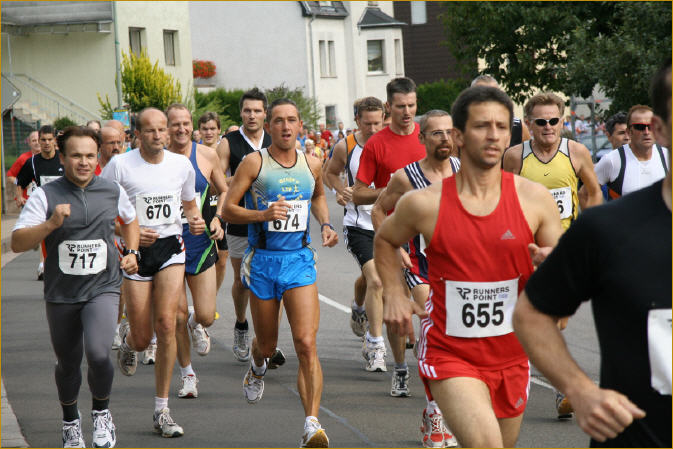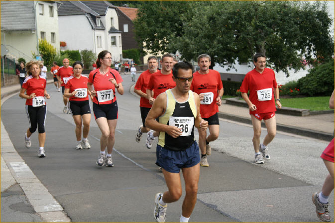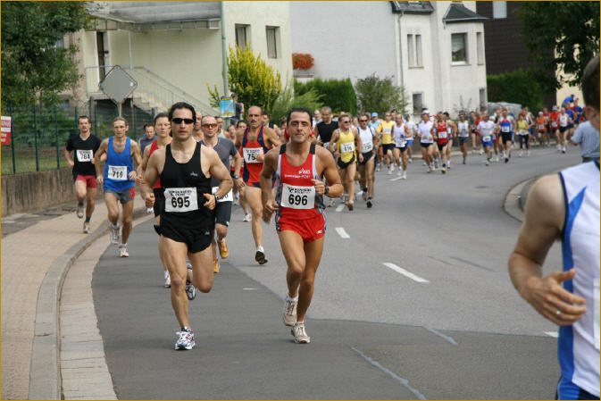 Am Start waren 180 Läufer und 15 Walker, die sich gleichzeitig um 17.30 Uhr auf den Weg machten. Das Wetter zeigte sich mit 21 ° und teilweise Sonnenschein oder leichte Bewölkung von seiner besten Seite. Nach 500 Metern flach folgte ein 2 km langer Anstieg. Danach ging es eben bis wellig über einen Höhenrücken bis KM 6. Hier begann die Ausweichstrecke mit 2,5 km starkem Gefälle. Danach kam die zusätzliche Steigung von 500 Metern und anschließend ging es bergab ins Ziel. Einige Teilnehmer fanden die ehemalige Strecke besser, andere waren begeistert von der Ersatzstrecke. Die am weitesten Angereisten waren Jones Roger und Beachle Claudia (Athletics Masterton Neuseeland). Außerdem wollte der ehemalige Wustweiler Bürger Bernhard Woll, der jetzt in Uppsala (Schweden) lebt und arbeitet, unser Jubiläumspräsent als Andenken an die Heimat erwerben.