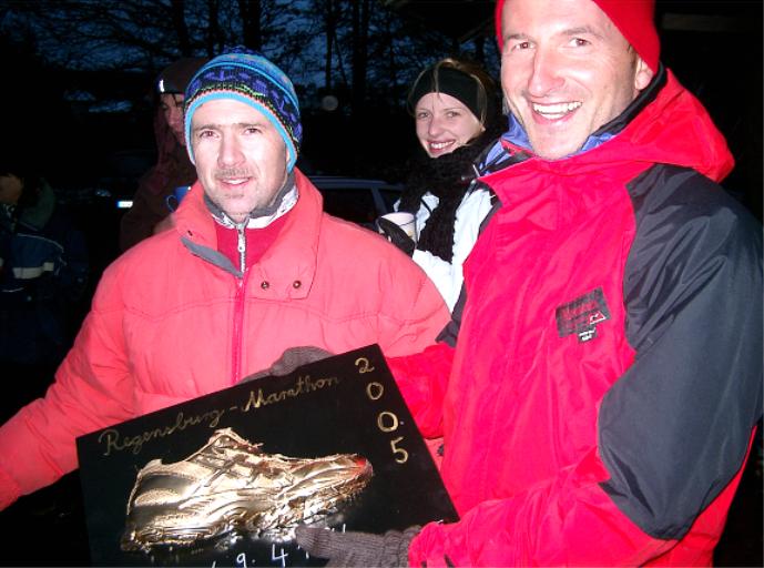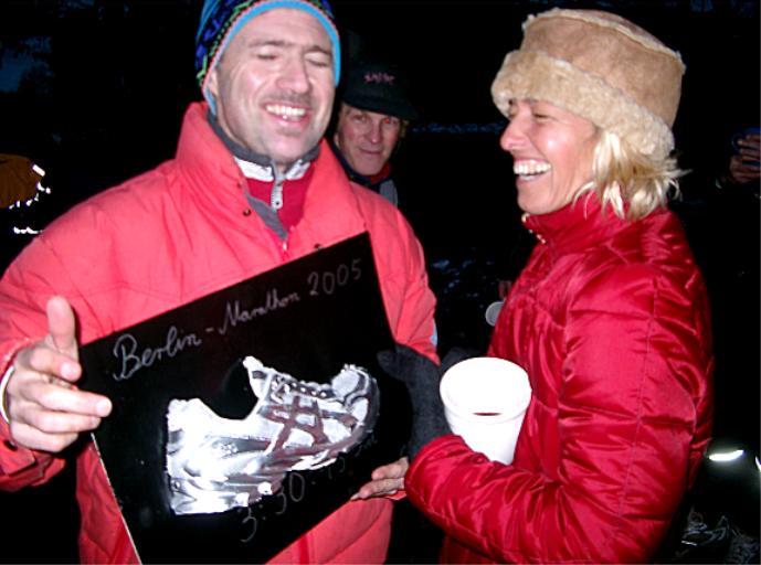 Wie jedes Jahr fand am 4. Advent-Samstag unser traditioneller Glühweinlauf statt. Daher war der Lauftreff bereits eine Stunde früher. Anschließend wurden Süßigkeiten mit Glühwein angeboten. Leider waren viele Mitglieder wegen anderer Termine verhindert. Das Wetter spielte auch mit, denn es blieb trocken bis zum Schluss. Im Rahmen dieses Events wurden Steffi und Christof wegen ihres ersten Marathons geehrt. Christof erhielt für die Endzeit von 2:49:41 Std. den "Goldenen Laufschuh" und Steffi für 3:30:13 Std. den "Silbernen Laufschuh". Herzlichen Glückwunsch!