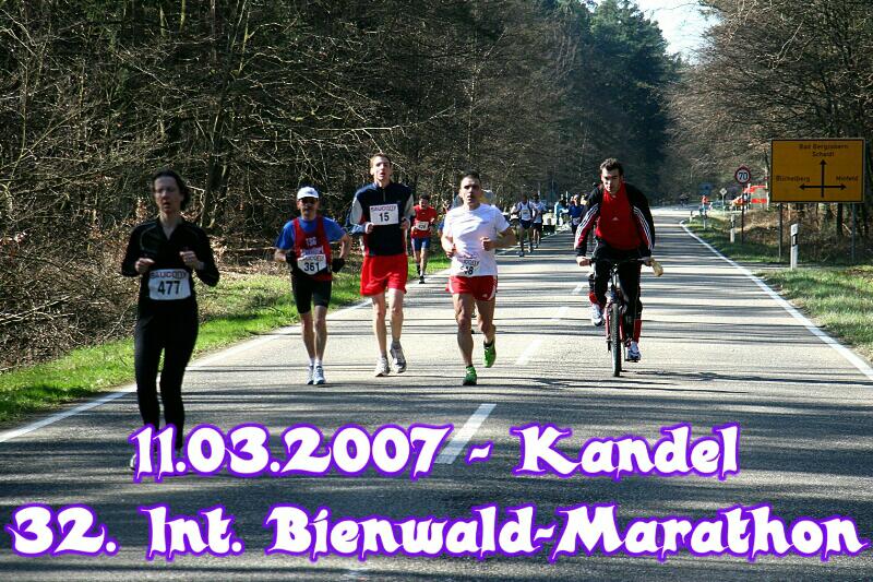 11.03.2007 - Jörg Ewen (Wustweiler) und Roland Raber nahmen am Bienwald-Marathon in Kandel teil. Bei herrlichem Sonnenschein aber niedrigen Temperaturen stand einem schönen Lauf nichts im Wege. Maria und Uli waren mit den Fahrrädern angereist um Roland und Jörg zu begleiten; für Roland aber zu spät, denn den sahen sie erst im Ziel wieder. Die beiden Kilometer-Junkies hatten für die Marathon-Distanz gemeldet, aber Roland hatte bis zum Schluss mit einer Erkältung zu kämpfen und entschied sich deshalb für den Halbmarathon. Eine kluge Entscheidung, denn die Gesundheit geht vor. Allerdings tat es ihm arg weh beim Halbmarathon-Wendepunkt umzudrehen, anstatt mit den Marathonläufern weiter zu laufen. Aber wie wir Roland kennen hat er bestimmt schon einen Ersatztermin vorgesehen. Nach 1:26:38 lief er als 142. von 1300 ins Ziel und belegte Platz 39 in der AK M40. Maria übernahm die persönliche Betreuung von Jörg und motivierte ihn bis ins Ziel. Mit was auch immer, jedenfalls hatte sie keine Peitsche dabei. Trotz vorangegangener Erkältung konnte er eine neue Persönliche Bestzeit erzielen. Nach 3:45:34 lief er als 331. von 640 ins Ziel. In der AK M35 belegte er den 52. Platz. Herzlichen Glückwunsch! Ergebnisliste - Bilder in der Galerie - Bilder - Bericht in Laufreport