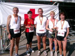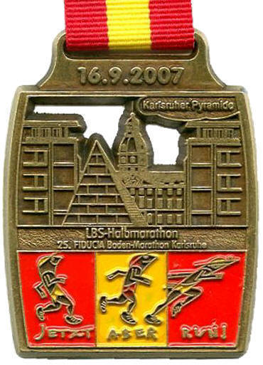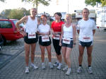 16.09.2007 - Beim 25. Jubiläumslauf des Karlsruhe Marathon waren über 10 000 Läufer am Start, davon etwa 2500 beim Marathon und 7500 beim Halbmarathon. Wir waren mit fünf Leuten beim Halbmarathon, außerdem war noch Rita Fuhrmann aus Hüttigweiler mit angereist. Wie es nun mal ist wenn Engel reisen - Bilderbuchwetter mit Temperaturen zwischen 12 und 15 °, während des Laufs, waren ideale Voraussetzungen für gute Leistungen. Und so waren auch alle mit ihren Zeiten mehr als zufrieden. Eine sehr schöne Strecke, aber nicht so viele Zuschauer wie in vergangenen Jahren. Die Frauen, diese sensiblen Wesen, beschwerten sich, dass unter ihrem Gewicht eine Brücke gewackelt hätte, was die Männer so nicht erlebt hatten. Cordula und Rita liefen den HM gemeinsam, wobei Cordula wieder eine neue PB erreichte, nur an den Duschzeiten muss sie noch etwas arbeiten, denn dafür benötigte sie fast genau so lange, wie für den Halbmarathon. Als Jubiläumsgeschenk erhielt jeder einen tollen Rucksack. Uta ist auf den Bildern nicht dabei, da wir sie nirgends entdecken konnten. |
