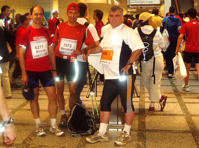11.09.2005 Köln. Bernhard Müller, Bruno Klein, Wolfgang Dörr und Udo Jakobs waren zum Marathon nach Köln gereist. Bruno und Bernhard liefen den Marathon und Wolfgang ging auf die 11,11 km lange Walkingstrecke. Ein fantastisches Comeback nach langer sportlicher Enthaltsamkeit. Nach 1:43 Std. überquerte Wolfgang die Ziellinie. Für Bernhard war es ein Jubiläumslauf, nämlich der 25. Marathon. Leider hatte er Magen-Darm-Probleme, so dass er seine angestrebte Zeit nicht einhalten konnte. Udo übernahm die Betreuung der drei. |