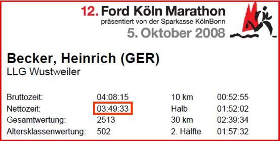 In der Tat war es ein „scheiß“ Wetter; z.T. starker Regen und heftiger und meist Gegenwind. Aber trotzdem bin ich mit meiner Zeit nicht ganz zufrieden – ich bin ca. 5 Minuten hinter meiner Zielzeit zurückgeblieben. Bis km 31 war ich voll im Plan – ca. 20-30 Sekunden unter meinem Schnitt – wie man an den Zwischenzeiten auch sehen kann. Dann kam so ziemlich alles zusammen und (fast) nicht’ s ging mehr. Obwohl ich ziemlich gut vorbereitet war, kam zu dem zu diesem Zeitpunkt besonders heftigen Regen und Wind dann sicherlich, dass ich am Vortag wohl zu viel zu Fuß unterwegs war und wahrscheinlich zu spät ausreichend getrunken habe, denn nachdem ich bei km 32 und 36 jeweils eine Flasche getrunken hatte, ging es wieder besser. Na ja, jetzt überlege ich, vielleicht noch am 26.10. in Frankfurt oder Saarbrücken zu starten. Plant sonst noch jemand aus dem Verein in Frankfurt zu starten?